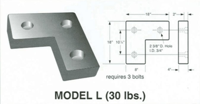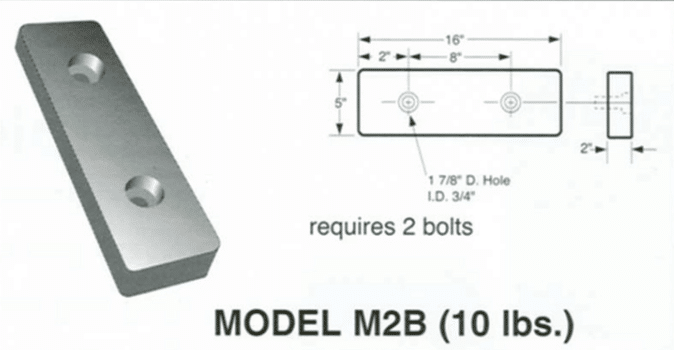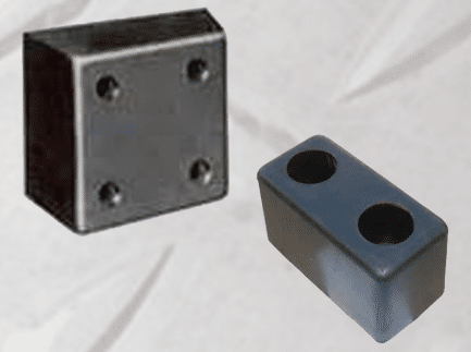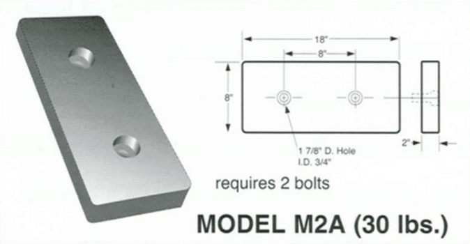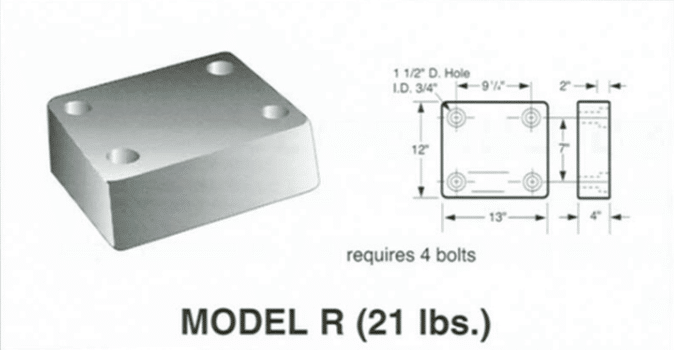 Molded bumpers are furnished with pre-set countersunk anchor holes 3/4″ in diameter. Anchors may be preset in new concrete or drilled into existing docks, Use 6″ bolts for pre-set anchors and 5″ bolts for drilled anchors. All bolts, hex nuts, and washers should be cadmium or galvanized plated.