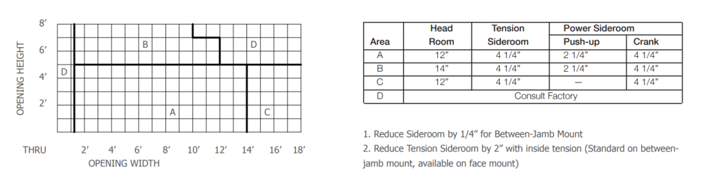 Push-up to 14′ wide and awning crank on larger sizes is standard (awning crank should be considered when doors are to be operated over a deep counter of over 7′ high). Chain hoist or motor operation are optional.